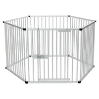 Oppdage verden på en sikker måte – ikke noe problem med valpeløpegården av aluminium. Det handler om et gitter som kan settes sammen på forskjellige måter for å gi valpen en mulighet til å leke og samle nye inntrykk ute i det fri, men i beskyttede omgivelser. Perfekt for valpeoppdrett.Løpegården er av robust, lett og rustfritt aluminium og er rask og enkel å sette opp eller ta ned. Dersom den ikke brukes eller må transporteres til en annen plass, åpner du skruforbindelsene og gitterelementene kan pakkes flatt og plassbeparende. Den består av seks gitterelementer, derav en med låsbar dør, og kan settes opp som firkant eller sekskant.