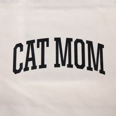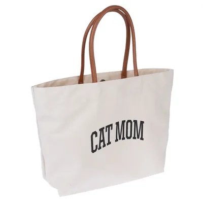 Handlenett i lerret for kattefans,lange avrundede håndtak, stor kapasitet, perfekt for shopping, "Cat Mom"-trykk, med liten innerlomme, lukkes med trykknapp,  farge: beigefor mer informasjon